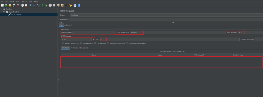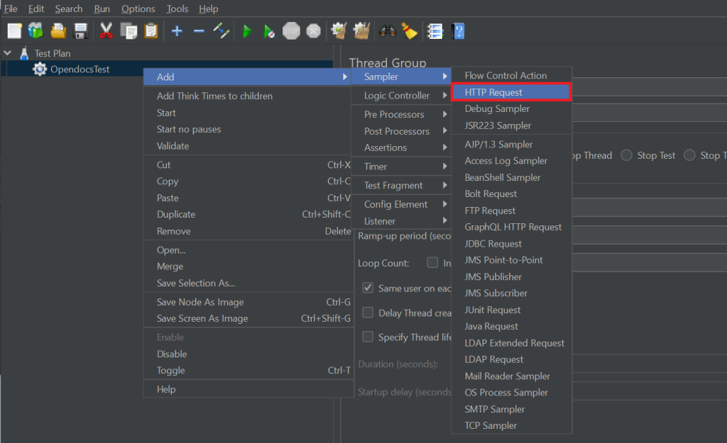 추가한 Thread Group (OpendocsTest) 우클릭 > Add > Sampler > HTTP Request