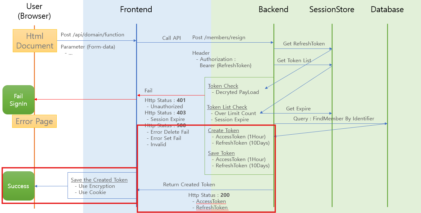 Frontend : 브라우저를 통해 전달된(cookie) 인증토큰을 서버사이드에서 복호화 한 후 RefreshToken을 헤더에 포함시켜 API 호출