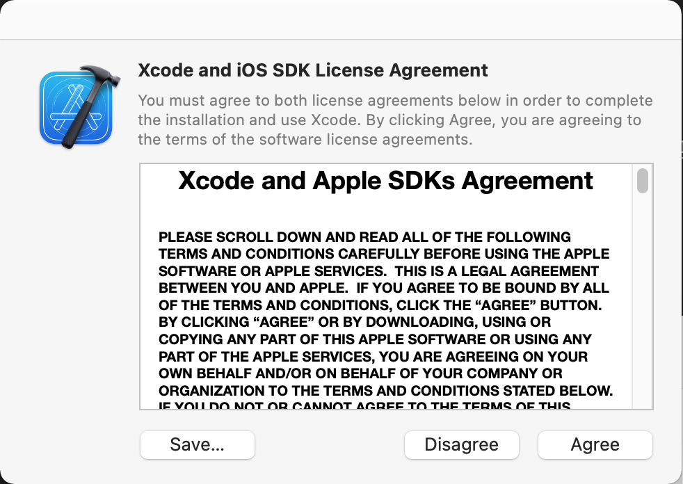 Launchpad > Xcode 실행 | 최초 실행시 라이센스 동의가 필요하다.