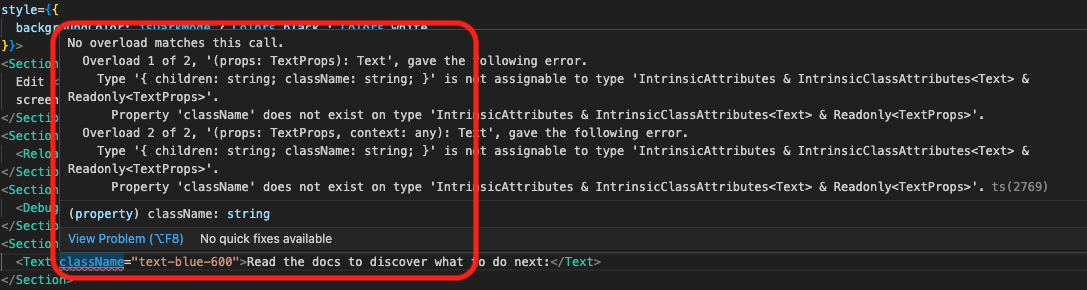 Type '{ children: string; className: string; }' is not assignable to type 'IntrinsicAttributes & IntrinsicClassAttributes<Text> & Readonly<TextProps>'.
