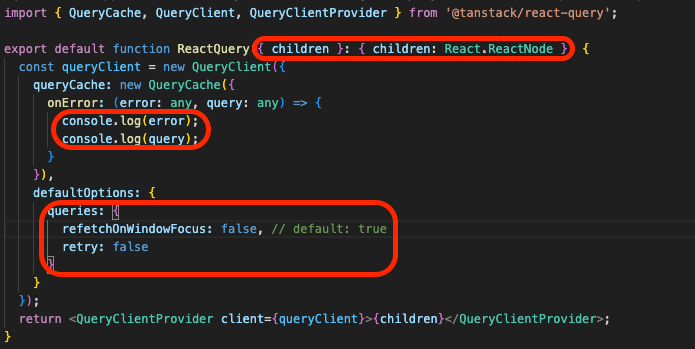 ReactQuery.tsx 파일을 분리해 에러처리 옵션설정을 할 수 있다.