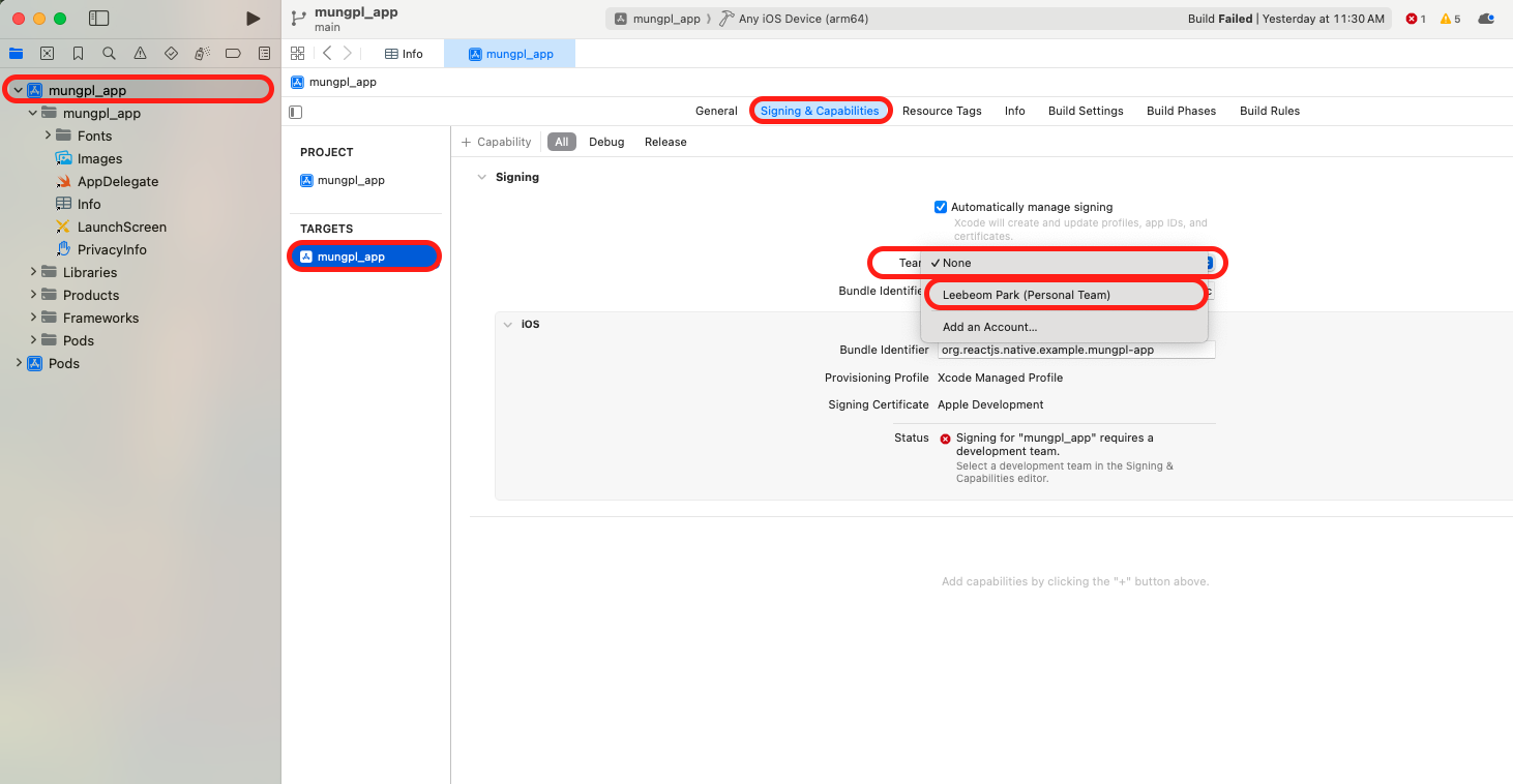 <4-3> 프로젝트 설정의 Signing & Capabilities 탭에서 팀선택