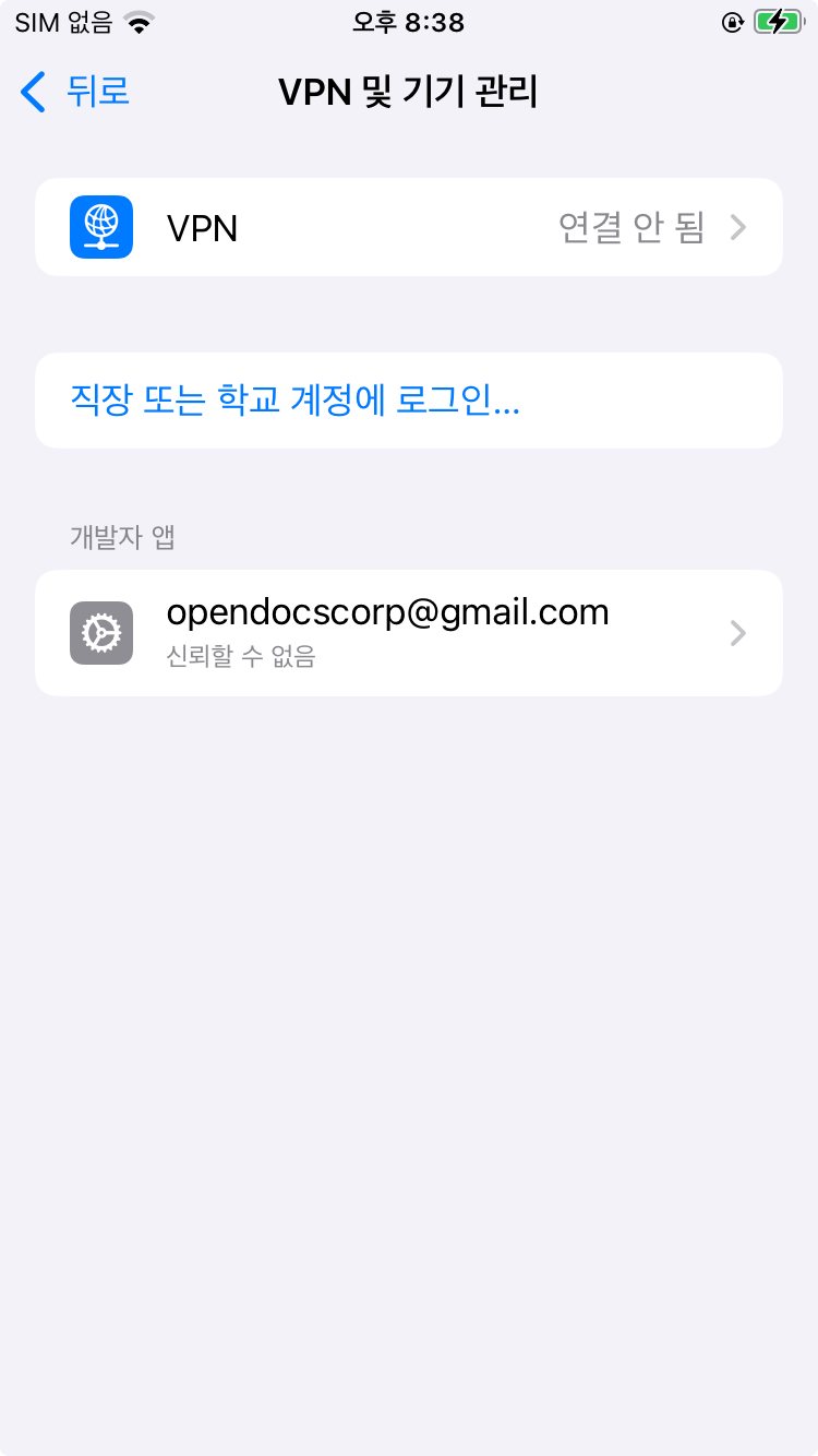 기기에서 설정 - 일반 - VPN 및 기기 관리 - 개발자 앱 (계정선택) - 신뢰 선택을 완료하면 앱이 설치된다.