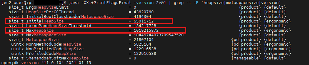 java -XX:+PrintFlagsFinal -version 2>&1 | grep -i -E 'heapsize|metaspacesize|version'