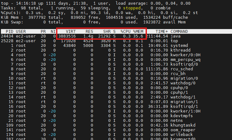 # VIRT : 프로세스가 사용중인 메모리 (디스크 가상메모리 포함)