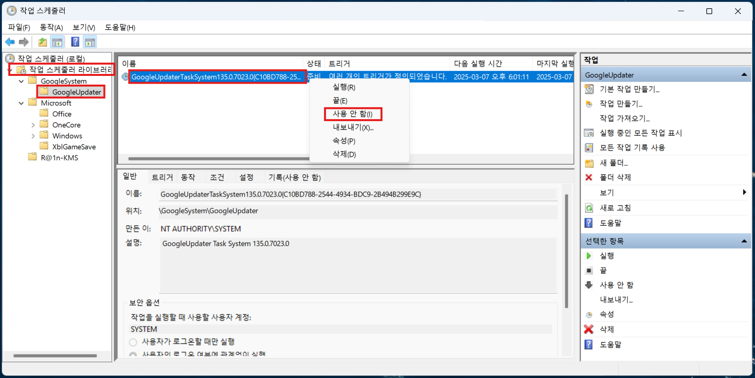 작업 스케쥴러 라이브러리 : GoogleUpdaterTaskSystem 사용안함 처리