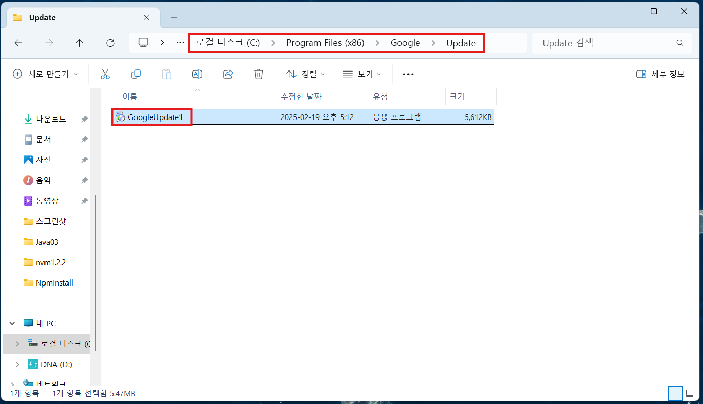 'C:\Program Files (x86)\Google\Update'에서 GoogleUpdate 파일명을 다른이름으로 변경 (ex. GoogleUpdate1)
