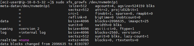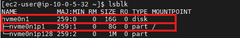 정상적용시 CHANGED 메시지가 출력된다. lsblk 명령으로 16G을 적용 확인한다.