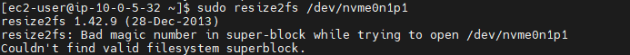 ## resize2fs: Bad magic number in super-block while trying to open /dev/nvme0n1p1
