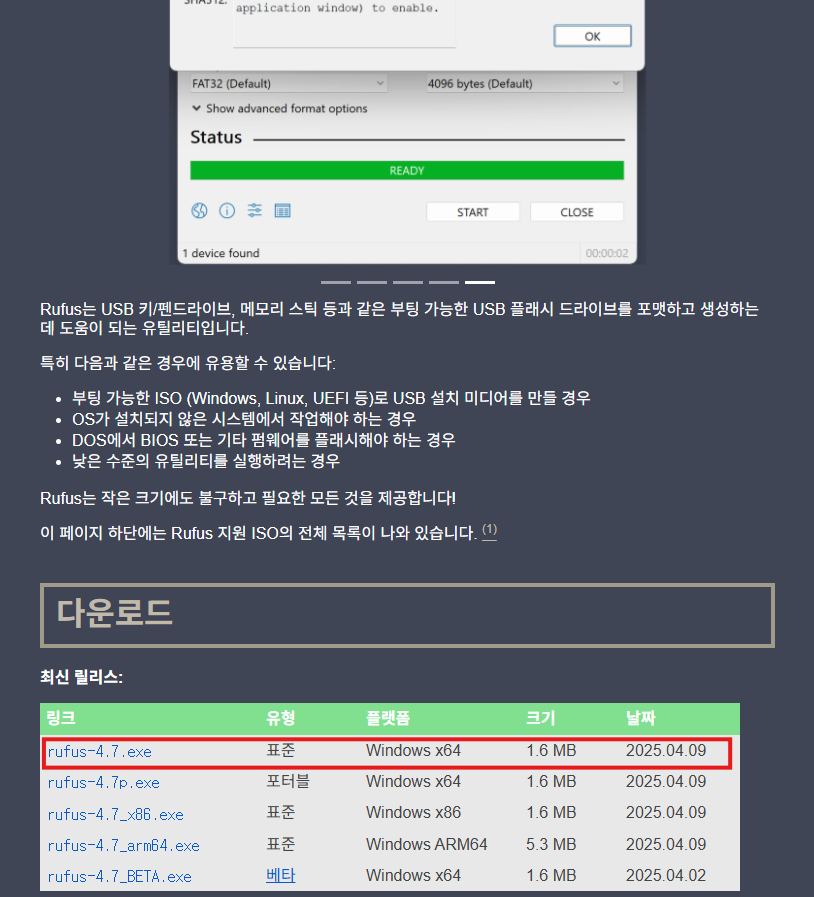 https://rufus.ie/ko/ - Link 에서 다운로드 - 최신릴리즈 rufus-4.7.exe (1.6 MB) download