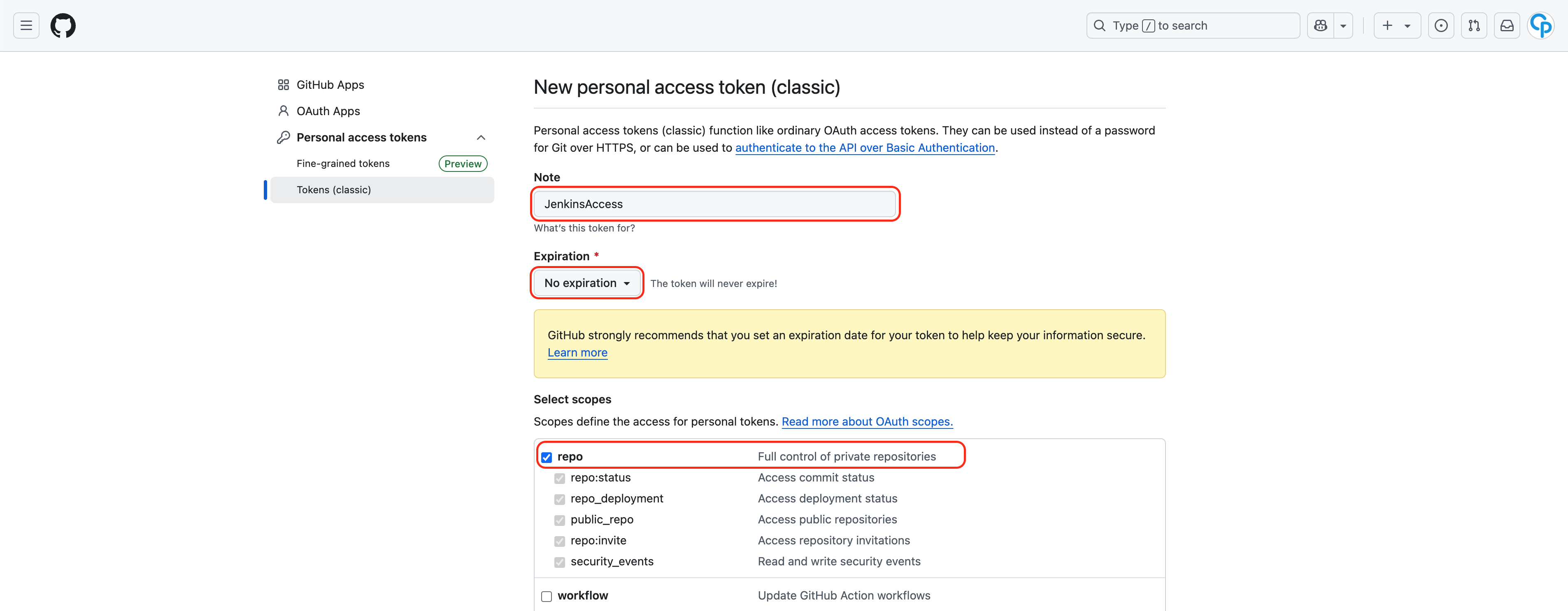 Select scopes : repo