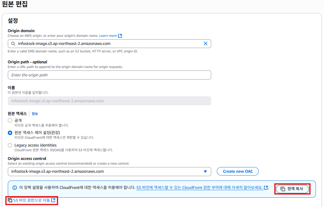 * Origin path - optional : 버킷 도메인 하위 경로로 연결시 (선택사항)