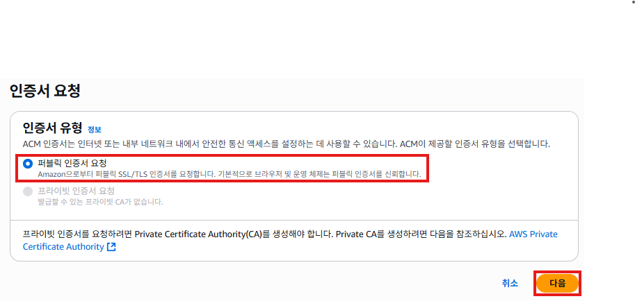 인증서 유형 : 퍼블릭 인증서 요청 선택 & 다음 클릭