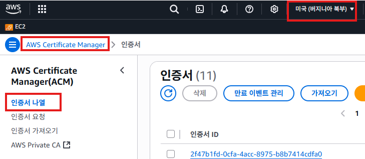 서비스 검색 AWS Certificate Manager : 인증서 나열 : Region 미국 (버지니아 북부) 선택 : 요청 클릭