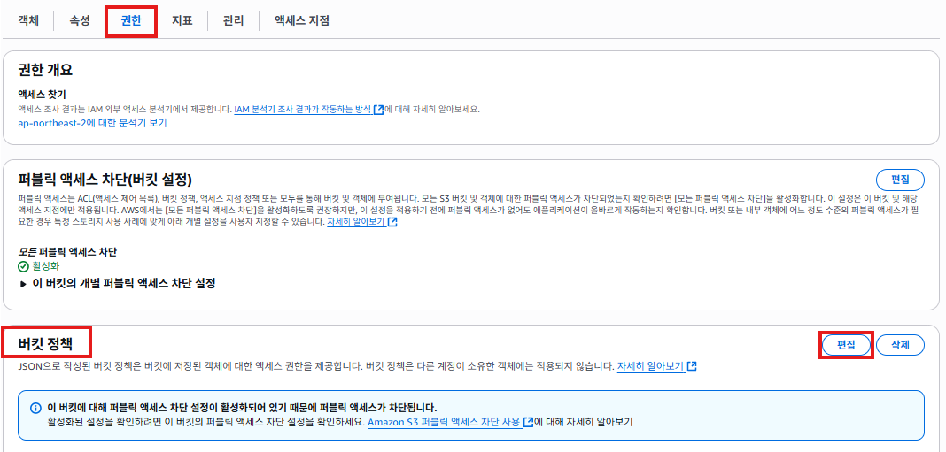 권한 탭에서 버킷정책 항목의 편집 클릭