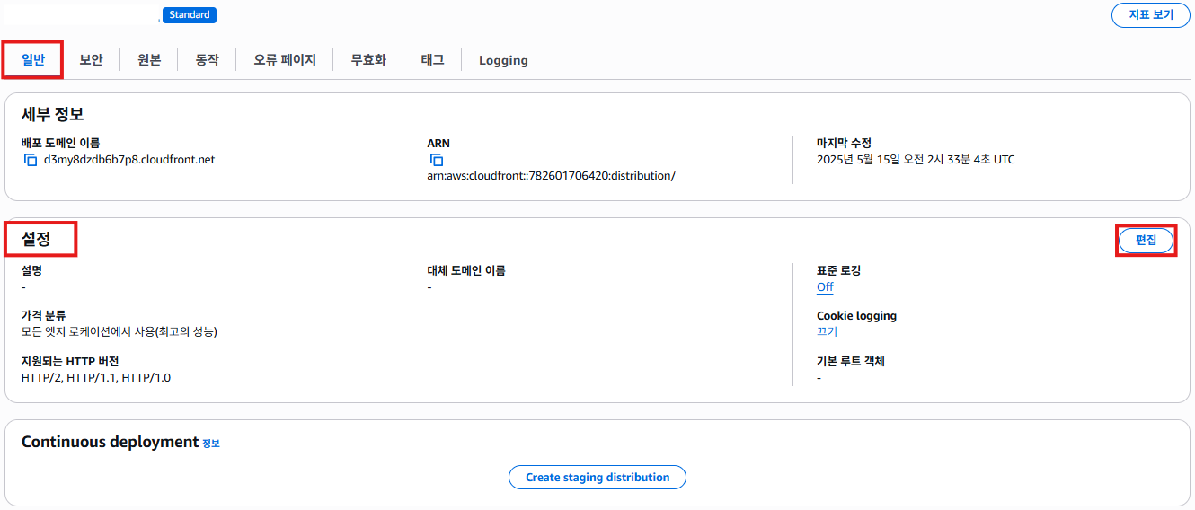 배포 목록에서 생성된 ID를 선택하고 일반 탭 : 설정 우측상단의 편집 클릭