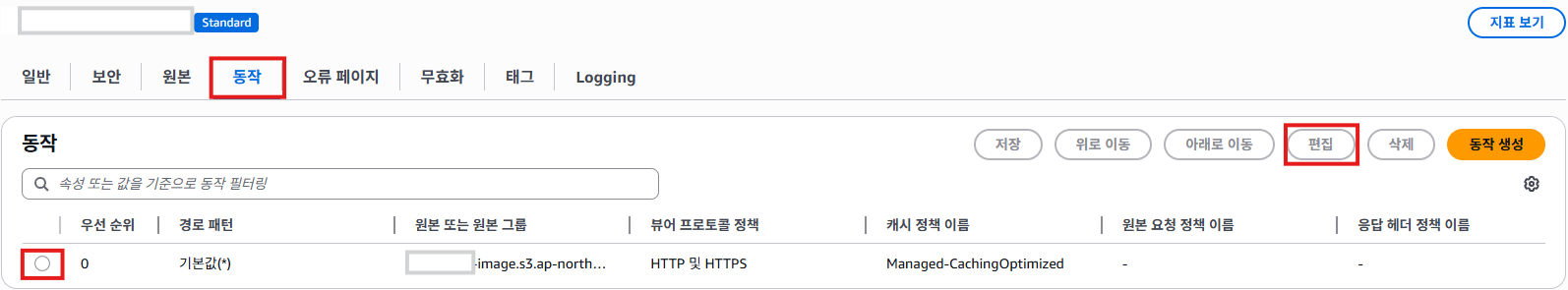 - CloudFront : 적용할 배포 선택 : 동작탭 : 선택 후 편집
