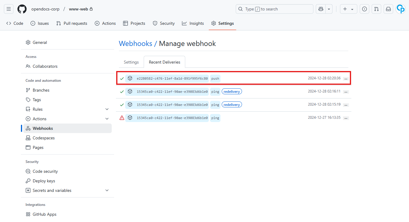 # Repository > Settings > Webhooks > Recent Deliveries 에 작동로그가 추가됨